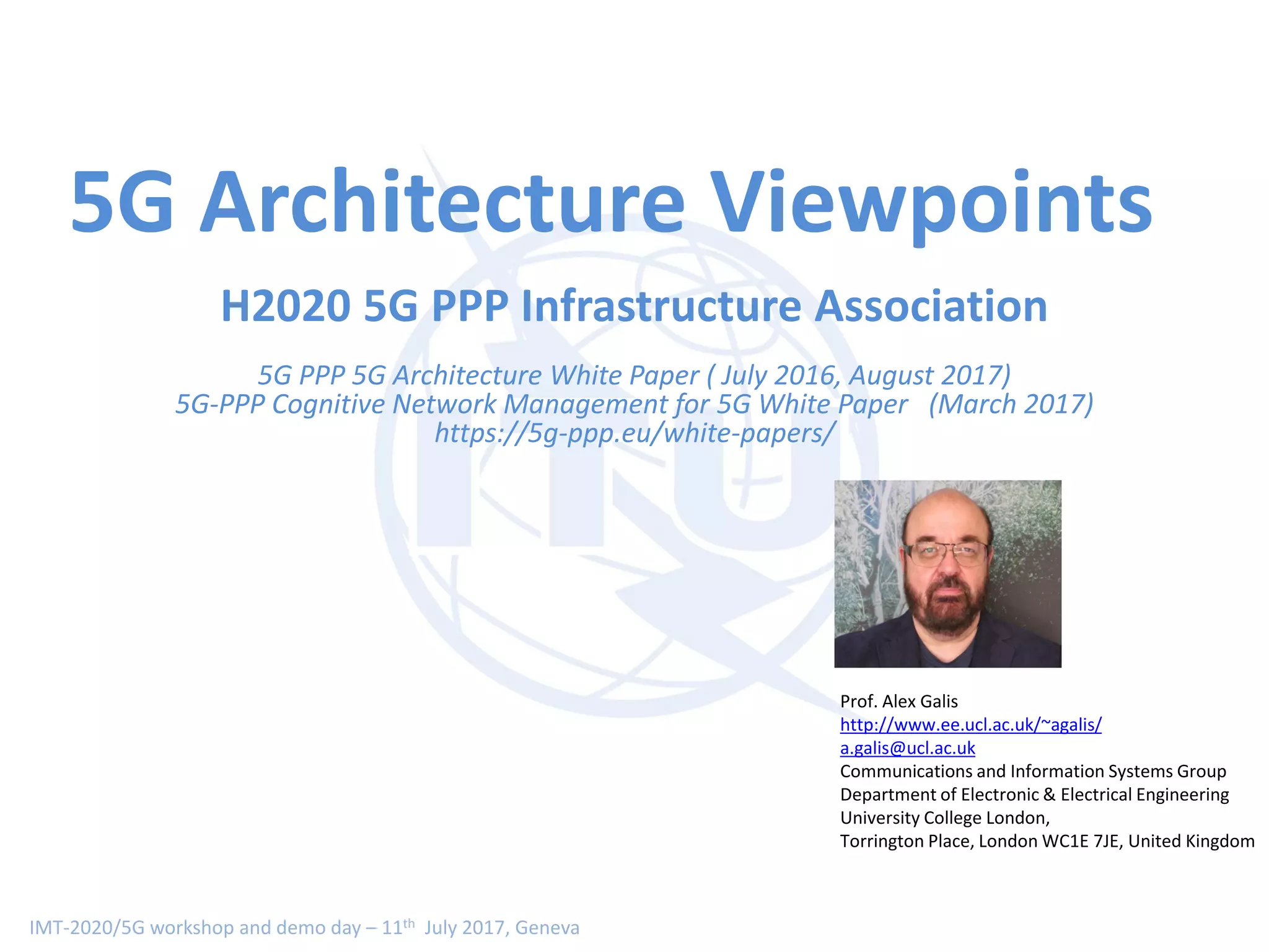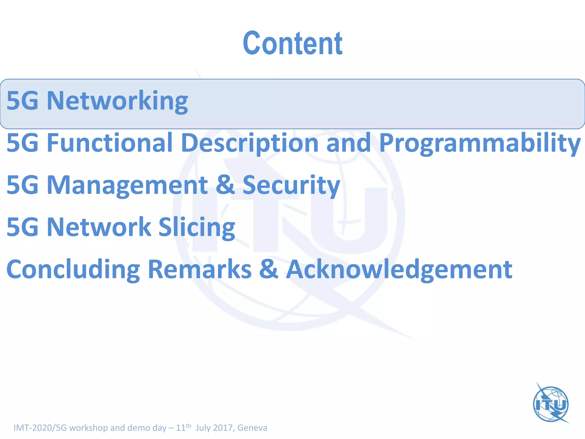 This document summarizes a presentation on 5G networking given on July 11, 2017 in Geneva. The presentation covered 5G networking, functional descriptions and programmability, management and security, and network slicing. It included information on 5G architecture viewpoints, 5G networking drivers and principles, network slicing, functional layers, programmable hardware, management and orchestration, and security domains. Slides from the presentation provided more details on each of these topics.