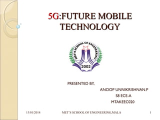 Anoop Unnikrishnan.P presented on 5G mobile technology. The presentation provided an overview of 5G, objectives to comprehensively study 5G and understand its architecture. It discussed the evolution of mobile technologies from 1G to 5G, highlighting increasing data speeds and capabilities. Key aspects of 5G architecture including layers, features like remote management and applications like global networks were outlined. The future scope of 5G with technologies like wearables and AI was also examined before concluding 5G will be a new wireless revolution and dominant technology.