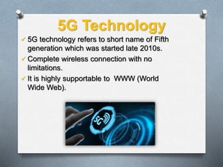 5G technology refers to the fifth generation of wireless technology that began development in the late 2010s. It provides high-speed, high-capacity wireless connectivity without limitations and strongly supports the World Wide Web. 5G enables faster data transmission than 4G and previous generations, allowing for high-quality multimedia streaming, interactive voice and video communications, and support for technologies like the Internet of Things, autonomous vehicles, smart cities, and virtual/augmented reality.