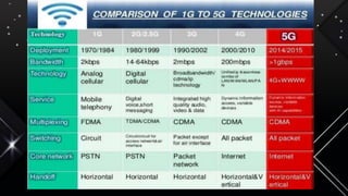 5G technology will provide wireless communication with almost no limitations and incredible transmission speeds up to 1Gbps. It is expected to have 10 times more capacity than 4G and be faster, more reliable, and lower in cost than previous generations. 5G will use ultra wide band networks and smart antennas to achieve these improvements over 4G. It will allow for less traffic congestion and connectivity speeds of 25Mbps or more for both uploading and downloading.
