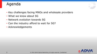 The document discusses the challenges faced by mobile network operators (MNOs) and wholesale providers, focusing on operational expenditure (opex) management, network simplification, and performance improvement as they transition towards 5G. It outlines key 5G goals, including vastly increased data volume, device connectivity, and enhanced user data rates driven by technologies like software-defined networking and network functions virtualization. Additionally, it emphasizes the importance for MNOs to begin investing in 5G solutions now rather than waiting for the technology to fully develop.