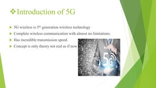 5G wireless is the next generation of mobile network technology that will offer significantly faster speeds and lower latency. It aims to provide speeds up to 1Gbps, around 10 times faster than 4G networks, and connect nearly all devices. The document traces the evolution of wireless technology from 1G in the 1980s with speeds up to 2.4kbps to 4G in 2010 with speeds up to 100Mbps. 5G is expected to be introduced in the 2020s and will offer global connectivity, dynamic information access, and applications powered by artificial intelligence at lower costs than previous generations.