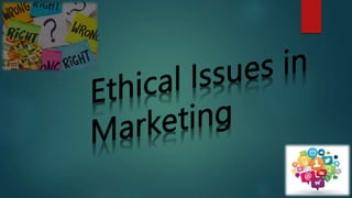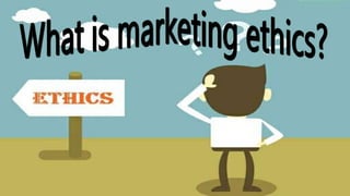 This document discusses marketing ethics. It defines marketing ethics as the principles and standards that govern acceptable conduct in marketing. Ethical marketing refers to applying these principles to the marketing process. The document outlines some ethical issues that can arise in different aspects of marketing like product development, pricing, distribution, and promotion. It provides examples of unethical practices in each area. Finally, it discusses some key ethical norms and values that marketers should embrace, such as honesty, responsibility, respect, transparency, fairness and citizenship.