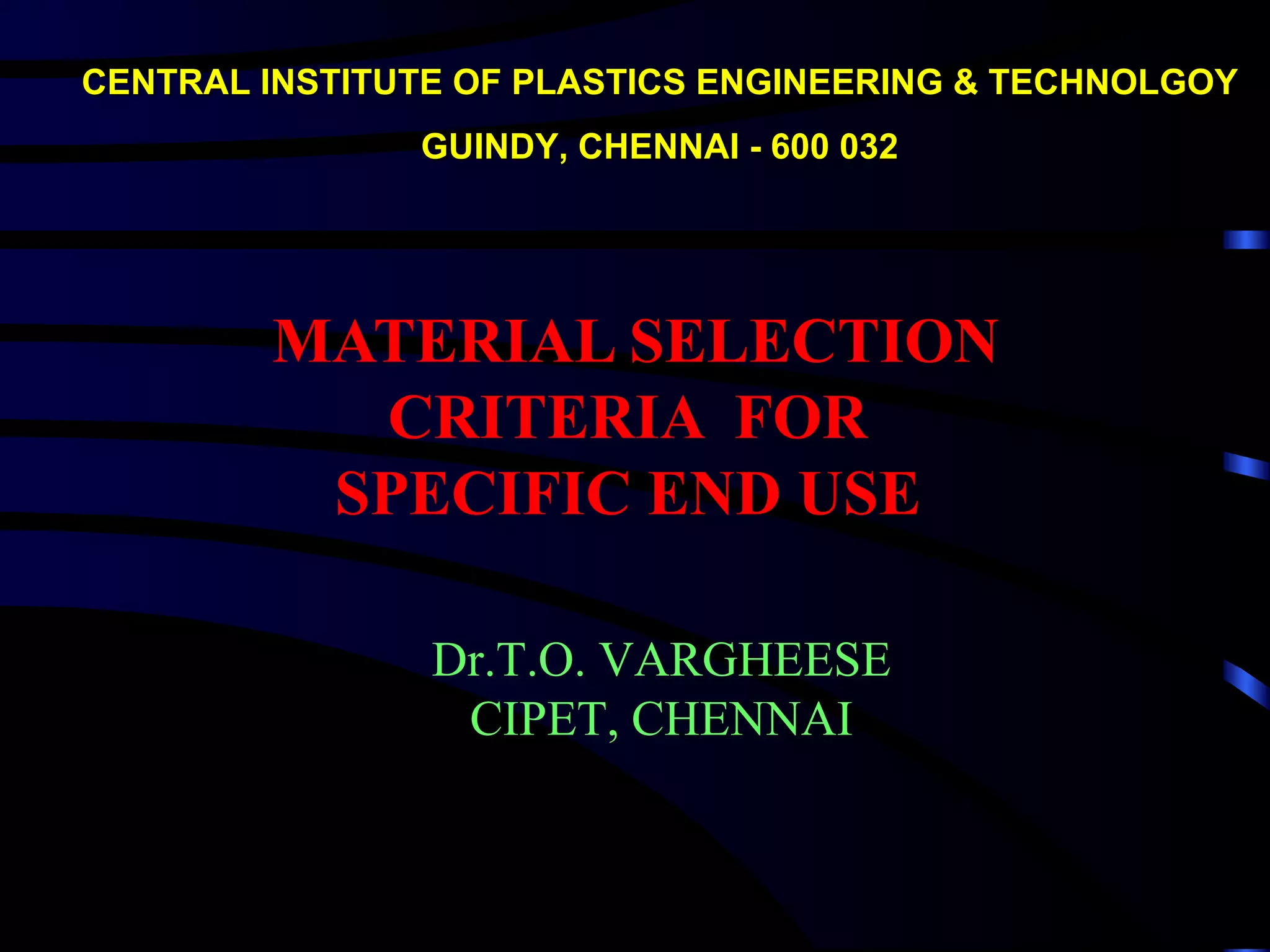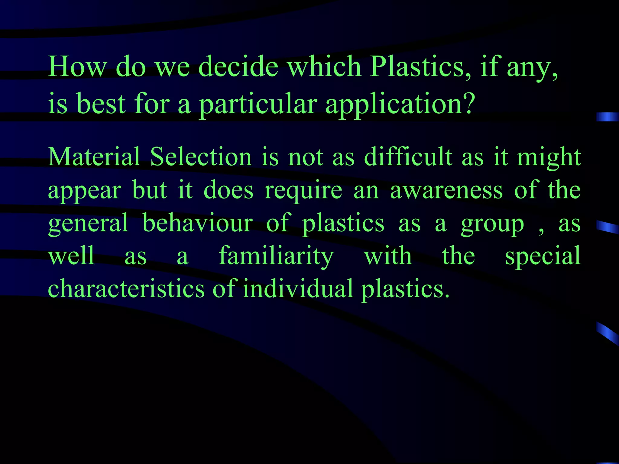 The document discusses material selection criteria for plastics in specific applications. It outlines the process of selecting plastics which involves defining the product purpose, assessing material properties, and considering factors like strength, temperature resistance, wear resistance, degradation resistance, and special properties. The document provides data on various plastic materials and their properties to guide selection. Key properties discussed include tensile strength, fatigue resistance, toughness, corrosion resistance, coefficient of friction, and electrical and thermal properties. Examples are given of applications suited for different plastics based on required characteristics.