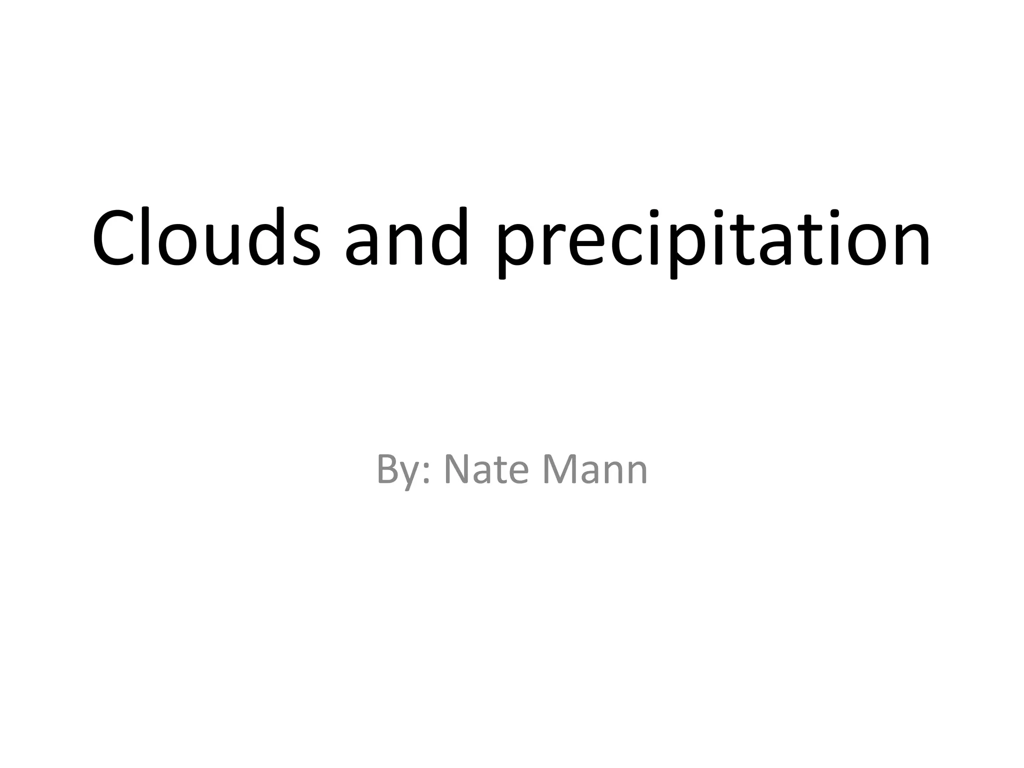 This document summarizes different mechanisms for cloud and precipitation formation. It discusses how adiabatic temperature changes cause air to cool and condense as it rises upward or expands. It also describes how orographic lifting can cause the windward sides of mountains to receive more rain, while rain shadows form on the leeward sides. Finally, it mentions how frontal wedging occurs when warm and cold air masses collide at a front.