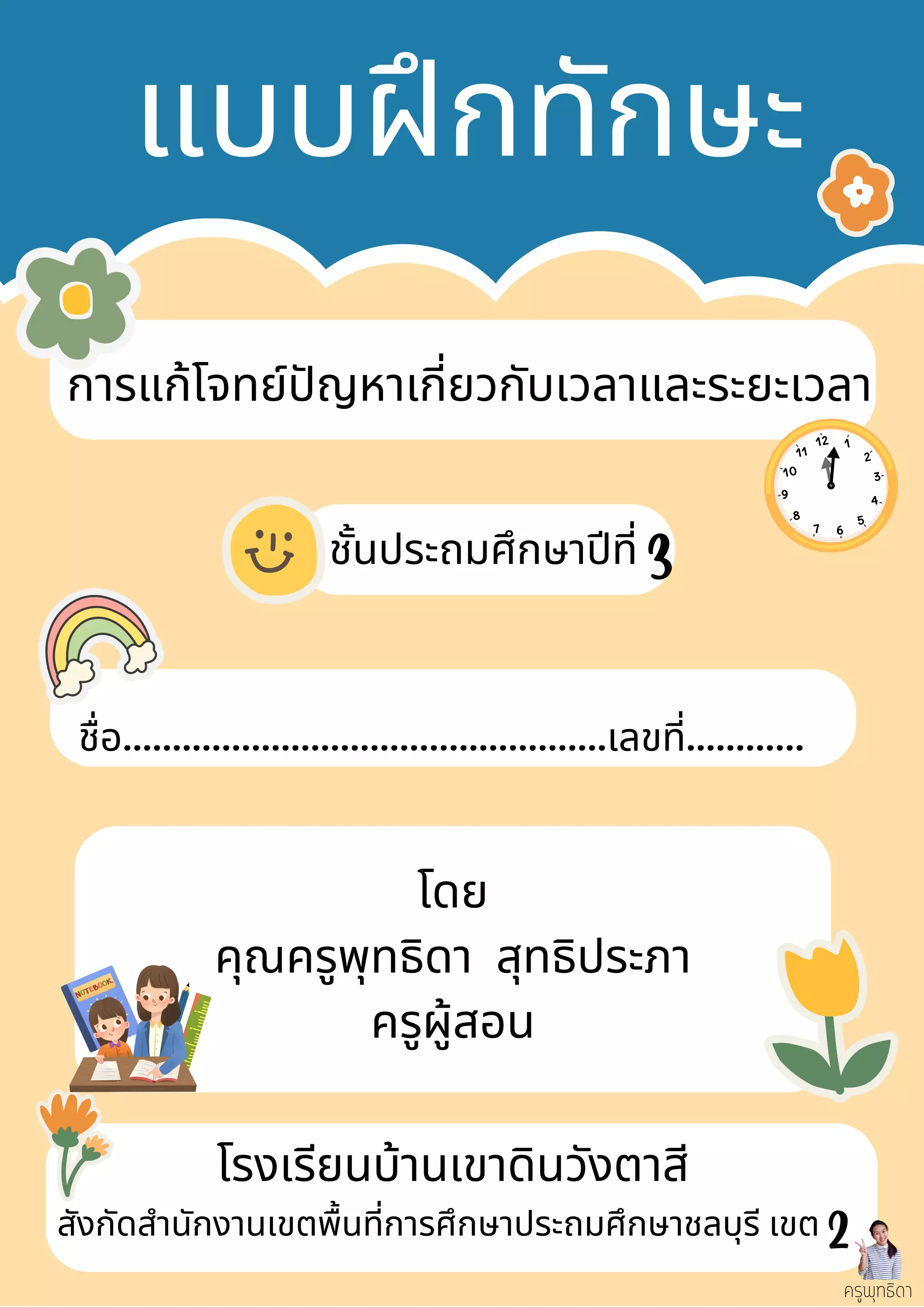 แบบฝึกทักษะแก้โจทย์ปัญหาเกี่ยวกับเวลาและระยะเวลา ระดับชั้นประถมศึกษาปีที่ 3 เพื่อช่วยแก้ปัญหานักเรียนที่ยังไม่เข้าใจบทเรียน ให้นักเรียนได้ฝึกทักษะการแก้วปัญหา ในหน่วยการเรียนรู้ที่ 3 เรื่องเวลา