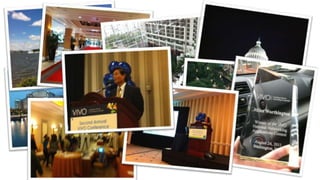VIVO is an open source software and community that aims to facilitate research discovery by creating a platform to connect data about people, publications, funding, events, and more. It extracts and links this information using ontologies. VIVO generates HTML and RDF representations of the data to allow for presentation, search, and analysis tools like ScienceMap to examine collaborations. The VIVO community includes scientists, implementers, and developers who work to augment the data and develop new tools and visualizations to further research discovery goals.