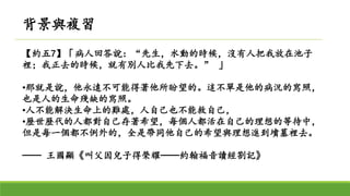 約翰福音第五章探討了病患者的癱癏和耶穌在安息日治癒他的事件,強調罪與疾病的關係以及安息日的含義。耶穌指出,祂在安息日行神跡的理由是神不停止工作,而祂所行的事乃是父所做的事,這引起猶太人的爭議。此章還討論了復活的概念和信徒在安息日的實踐,強調靈性的安息及與神的關係。