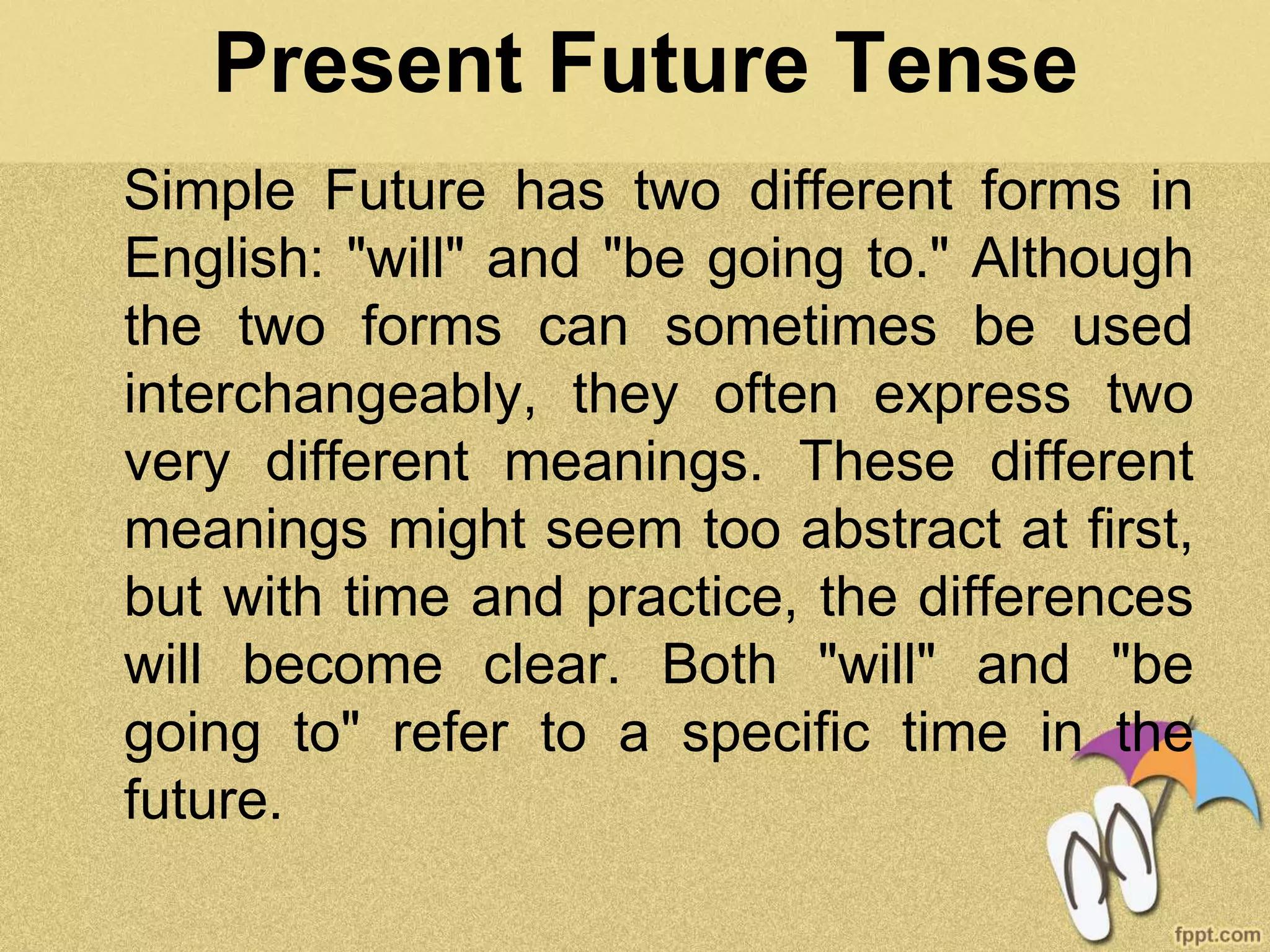 The document discusses the differences between using "will" and "be going to" to talk about the future in English. While the two forms can sometimes be used interchangeably, they often express different meanings. "Be going to" refers to a plan or intention, indicating something that has already been planned to happen. "Will" refers to predictions, voluntary actions, or promises about the future, and is used when giving information about an uncertain future event or offering to do something for someone. The document provides examples of how to use each form correctly in sentences.