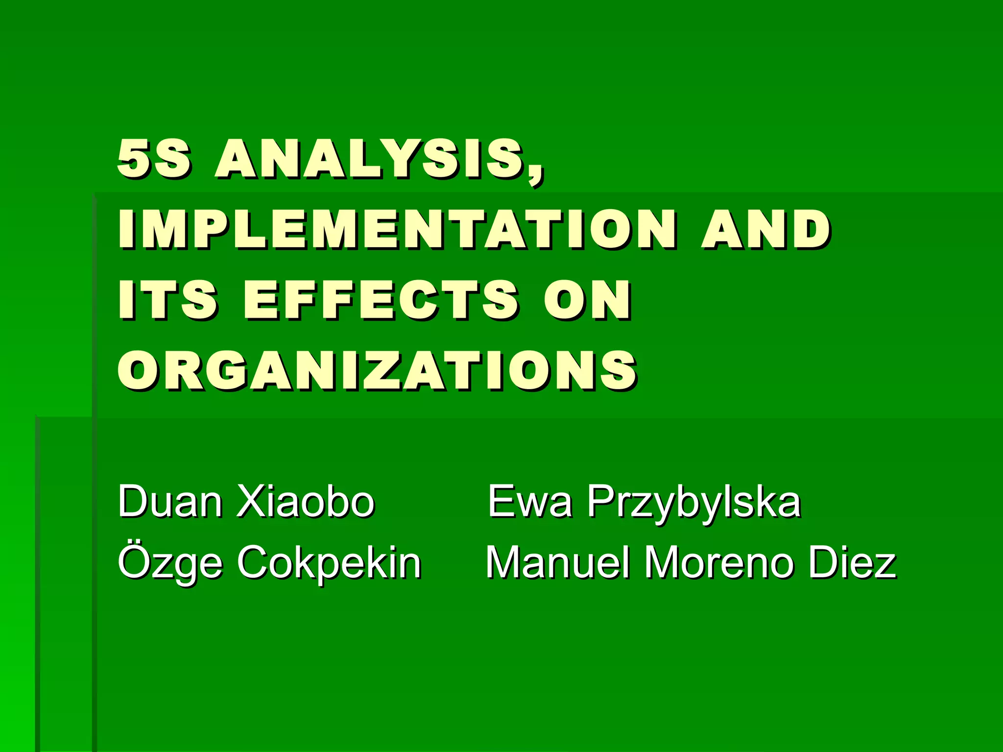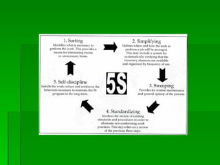 This document discusses 5S, a Japanese methodology for organizing and standardizing the workplace. It consists of five steps: sort, set in order, shine, standardize, and sustain. The document outlines each of the 5S steps and how to implement 5S through clear objectives, communication, training, and regular updates. It explains that 5S improves efficiency, reduces waste, enhances safety, and promotes continuous improvement and a competitive advantage for organizations.