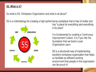 1. The 5S methodology focuses on workplace organization and cleanliness to identify waste and improve visibility of operations.
