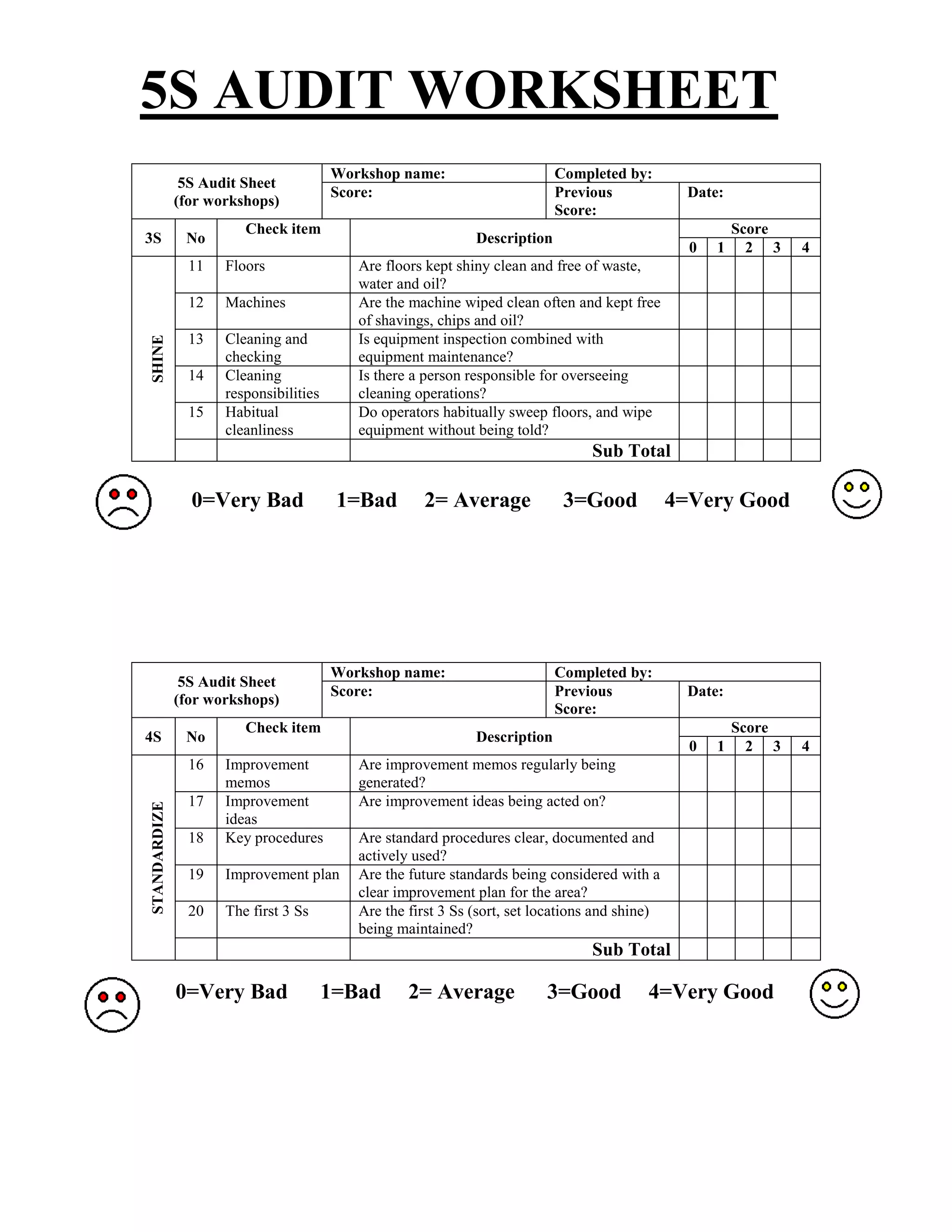 This document contains a 5S audit worksheet to evaluate implementation of 5S (Sort, Set In Order, Shine, Standardize, Sustain) in a workshop. It includes 25 check items across the 5 categories to assess aspects like unnecessary inventory, cleanliness of machines and floors, visual controls, documented standards, training, and adherence to procedures. Scores from 0 to 4 are given for each item, with 0 being very bad and 4 being very good. The previous and current total scores are recorded to measure improvement over time in implementing the 5S methodology to organize and clean the workshop.