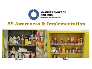 The document outlines the principles, history, and implementation of the 5S methodology for workplace organization, which includes sorting, systemizing, sanitizing, standardizing, and sustaining. It emphasizes the benefits of 5S in improving efficiency, safety, and workplace culture while providing a structured approach for effective implementation. Participants will learn to understand and apply 5S principles to enhance productivity in their organizations.