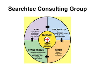 The document discusses the 5S methodology for organizing and managing workspaces. 5S stands for five Japanese words that start with "S" and represent techniques for sorting, setting in order, shining, standardizing, and sustaining a organized workspace. Implementing 5S in a systematic way through training and teamwork can increase efficiency, quality, safety and morale by eliminating waste and ensuring everything has a clear place.