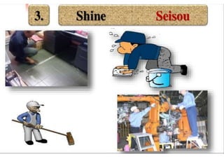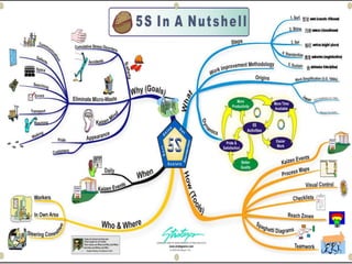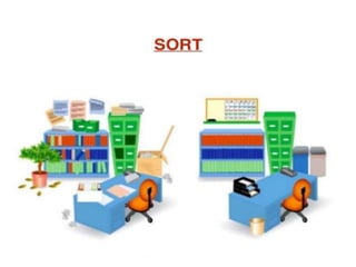 This document outlines the 5S methodology for organizing and standardizing a workplace. The 5S steps are: Sort, Set in Order, Shine, Standardize, and Sustain. For each step, the document defines the key activities and provides levels for achieving the goals of that step, from just beginning to continuously improving. Implementing 5S is intended to create a more efficient work environment through eliminating waste, improving storage of needed items, maintaining cleanliness and safety, and sustaining high standards of organization.