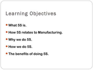 This document outlines the 5S methodology, which consists of five pillars - Sort, Set In Order, Shine, Standardize, and Sustain. The 5S process is designed to organize, clean, and standardize the workplace. It describes each of the five pillars in detail, providing examples of how to implement techniques such as visual controls, future workplace mapping, cleaning schedules, and documentation of work processes and standards. The benefits of 5S include improved safety, efficiency, and employee morale through a clean and orderly work environment.