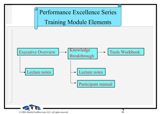 The document discusses strategies for performance excellence including 5S implementation. It provides an overview of 5S which includes five elements: systematic organization, sorting visual placement, scrubbing clean, standardizing control, and self-discipline control. The purpose of 5S is to eliminate waste through bringing order and cleanliness to the workplace.