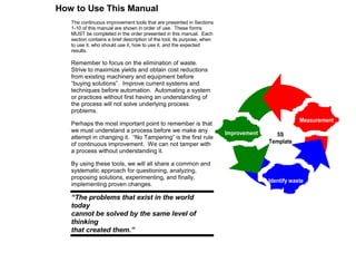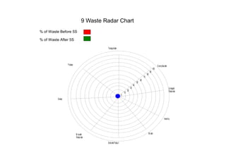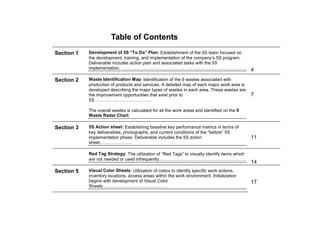 This document provides an overview of the 5S methodology for performance excellence. It discusses the five elements of 5S - systematic organization, visual placement, self-discipline/control, scrubbing clean, and standardizing control. The goals of 5S are to eliminate waste, improve organization and visual controls, and maintain standardized processes. Implementing 5S involves training, communication, identifying waste, and progressively enhancing organization, cleanliness and standardization.
