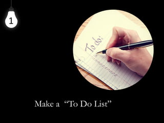 The document presents five simple tips to enhance personal productivity, including making a to-do list, using a working book to record ideas and notes, marking important emails for follow-up, writing ideas immediately, and leveraging mobile technology for time management. These strategies aim to streamline tasks and maximize efficiency in daily activities. The tips emphasize the importance of organization and immediate action to avoid losing valuable ideas and opportunities.
