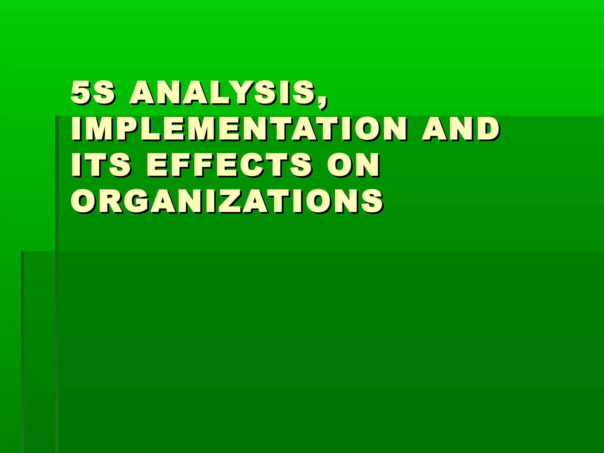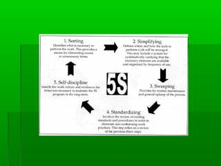 The document discusses the 5S methodology for organizing and standardizing the workplace. It describes the 5S steps of seiri (sort), seiton (set in order), seiso (sweep), seiketsu (standardize), and shitsuke (sustain). Implementing 5S creates a clean, organized workplace that improves efficiency, safety, and employee ownership. Proper communication, training, and management support are needed to successfully adopt the 5S system in an organization.