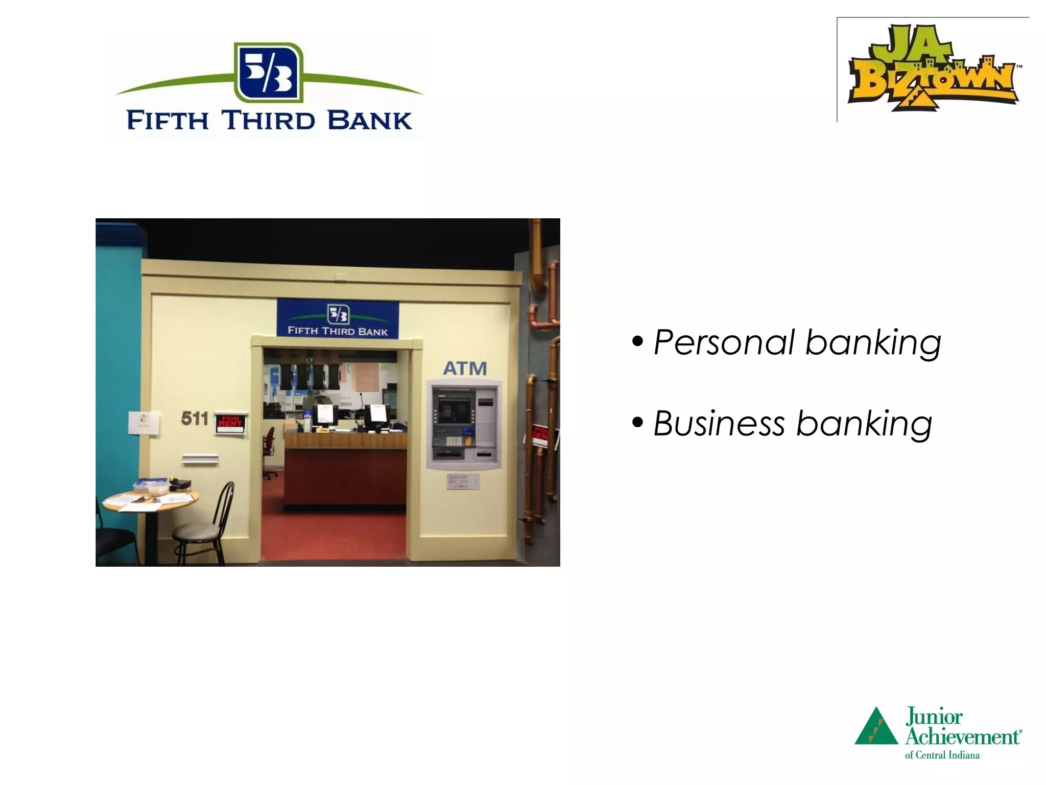#2 >>>Welcome to Fifth Third Bank, which serves as one of the financial hubs for JA BizTown. Students will come here twice during the day to deposit paychecks into their personal checking accounts. Students have been assigned checking account numbers before they arrive. The CFOs in all businesses have entered their names with those account numbers into the computer program during Business Start-up. >>> Half of the businesses have accounts at PNC Bank as well. >>>The businesses will be applying for a loan and making business deposits.