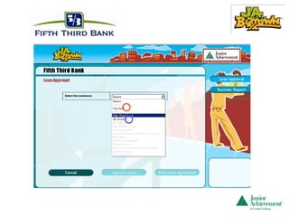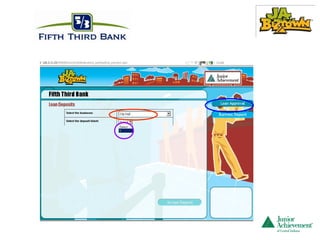 #27 If you would like to learn details about the CFO computer program, click on the link below. This is the end of your training for Fifth Third Bank. A JA staff member will speak with you on the visit day before the students arrive. Junior Achievement thanks you very much for serving as a volunteer. Remember that the students will not be perfect. Your role is to smile and be supportive. You do not complete their jobs. They are the workers and they are responsible. Encourage them to continue doing their jobs. Answer their questions. If you can’t answer the questions, please contact a JA staff member. Thank you!