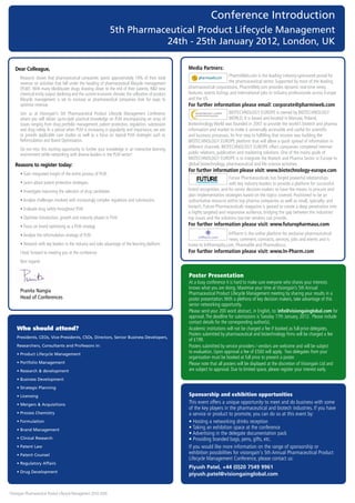 This document provides an agenda and details for the "5th Pharmaceutical Product Lifecycle Management" conference taking place on January 24-25, 2012 in London. The conference will focus on strategies for optimizing pharmaceutical product lifecycle management and will feature presentations from industry leaders on topics such as innovative portfolio strategies, benefit-risk evaluation, patent protection, drug safety, submissions and regulation, brand management, and portfolio management. The document outlines the schedule, speaker biographies, sponsorship opportunities, and reasons for attendees from pharmaceutical and biotechnology companies to register.