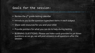 This document summarizes a parent night presentation about upcoming standardized testing for 5th grade students. It includes the testing schedule, types of test items, web resources for practice tests, and tips for helping students prepare like ensuring good sleep and a healthy breakfast. The testing will assess writing, math, English language arts, and science skills through computer-based and paper-based formats from March to April.