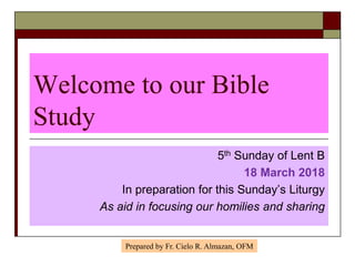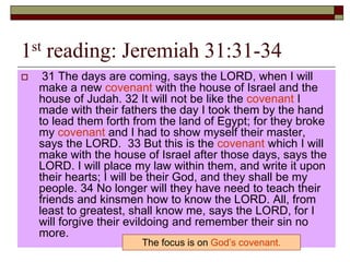 The document outlines the biblical readings for the 5th Sunday of Lent, focusing on themes of covenant, obedience, and the inevitability of death as exemplified by Jesus. The first reading from Jeremiah discusses a new covenant where God's law is written in people's hearts, while the second reading from Hebrews emphasizes learning obedience through suffering. The gospel from John highlights Jesus' impending death as a means to glorification and draws a parallel between his sacrifice and the necessity of dying to self for eternal life.