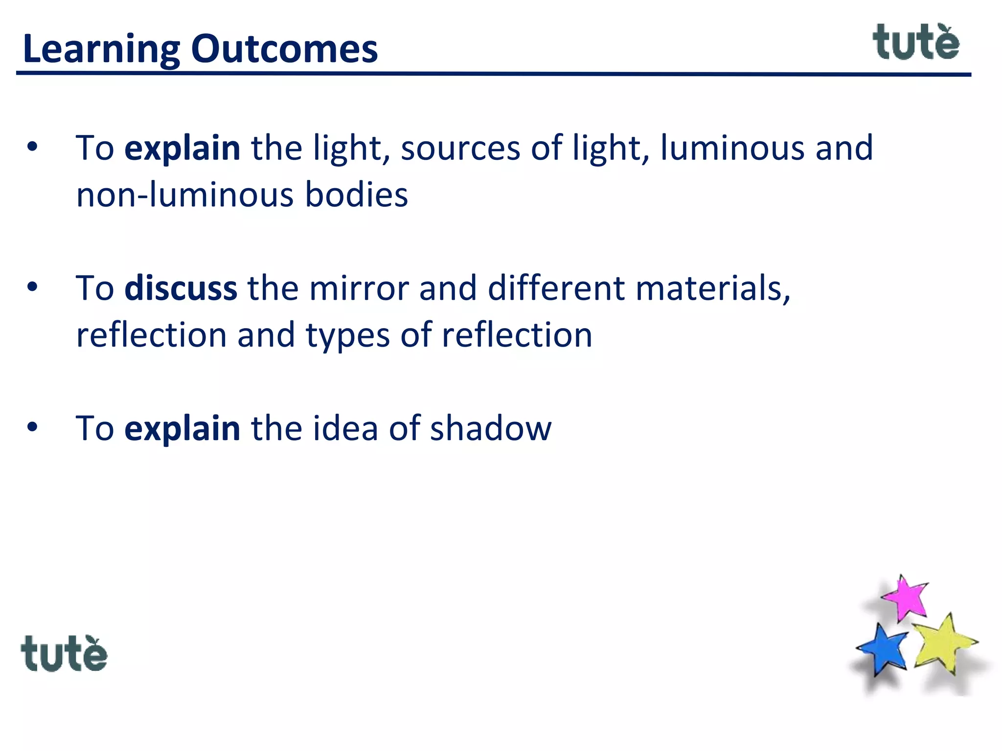 The document discusses light, sources of light, luminous and non-luminous bodies. It explains that light travels in straight lines and defines natural and artificial light sources. It also discusses mirrors, reflection, and different materials like transparent, translucent and opaque. Shadows are defined as dark areas formed when light is blocked. The learning outcomes are to explain these concepts of light, mirrors, reflection and shadows.