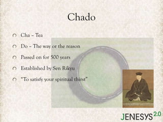 The document discusses Japan's traditional tea ceremony (chado) culture. It provides details on the philosophy and 4 principles of chado: wa (harmony), kei (respect), sei (purity), and jaku (tranquility). The document also describes a student visit to the Urasenke tea ceremony institution, where they observed demonstrations and participated as guests and hosts. It addresses why traditional cultures are important to preserve identities and cultural diversity, and discusses challenges to and approaches for continuing traditional cultures, including roles for government, companies, and youth.