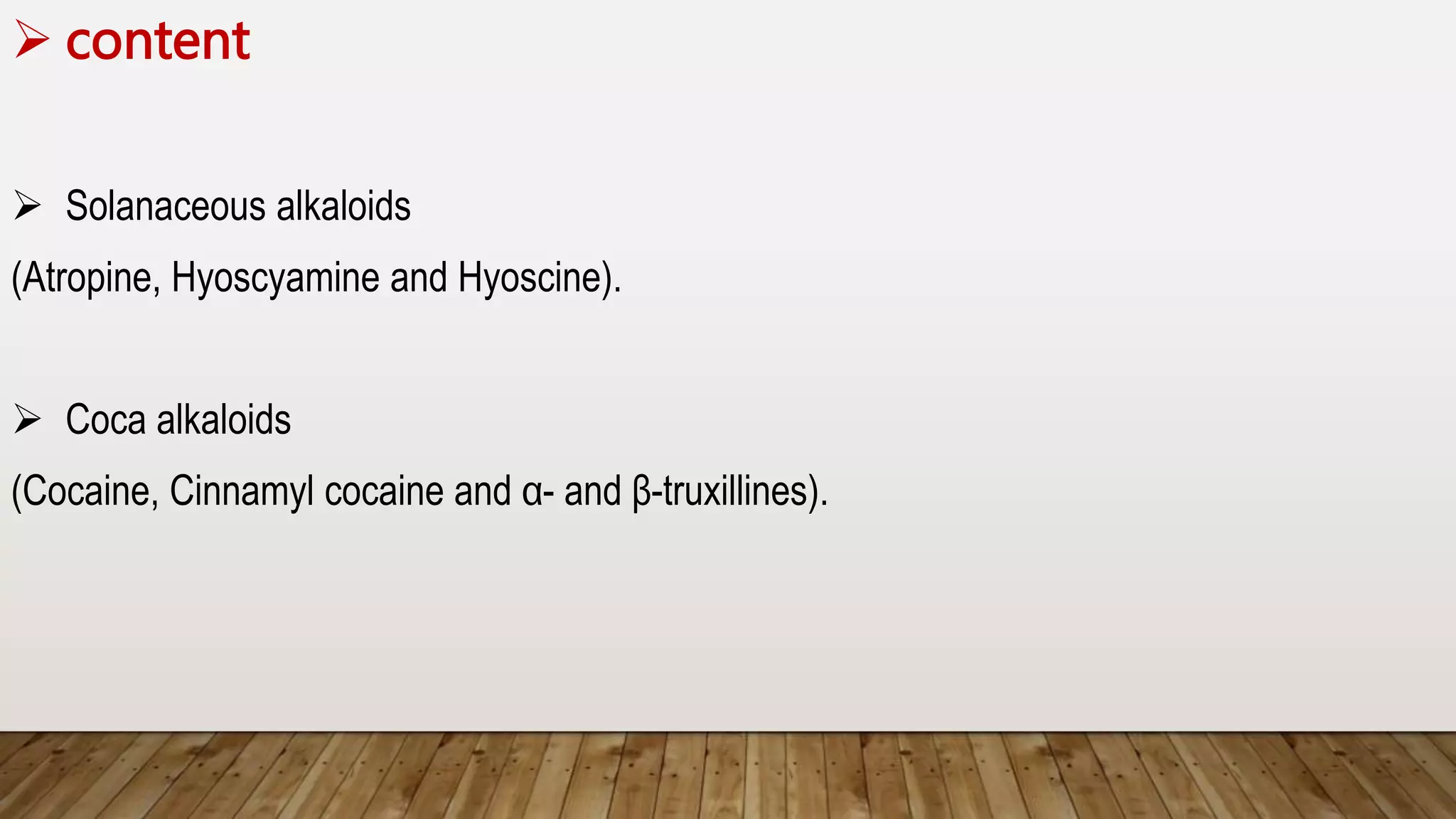 The document provides a detailed overview of tropane alkaloids, including structural information, classifications, and examples such as atropine, hyoscyamine, and cocaine. It discusses their synthesis, extraction processes, and pharmacological effects, highlighting the differences in activity and uses among various alkaloids. Furthermore, it addresses chemical tests used for identification and characterization of these compounds.