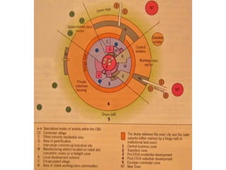 The document summarizes several theories and models of urban land use and morphology developed between the late 19th century and mid 20th century. It describes Ebenezer Howard's Garden City concept from 1898, which aimed to incorporate the best aspects of urban and rural life. It also mentions bid rent theory, sector models of urban land use, and concentric zone models that describe land use patterns with distance from the urban core. The models aimed to explain urban form and land use patterns but did not always reflect the complexity and changes in real-world cities.