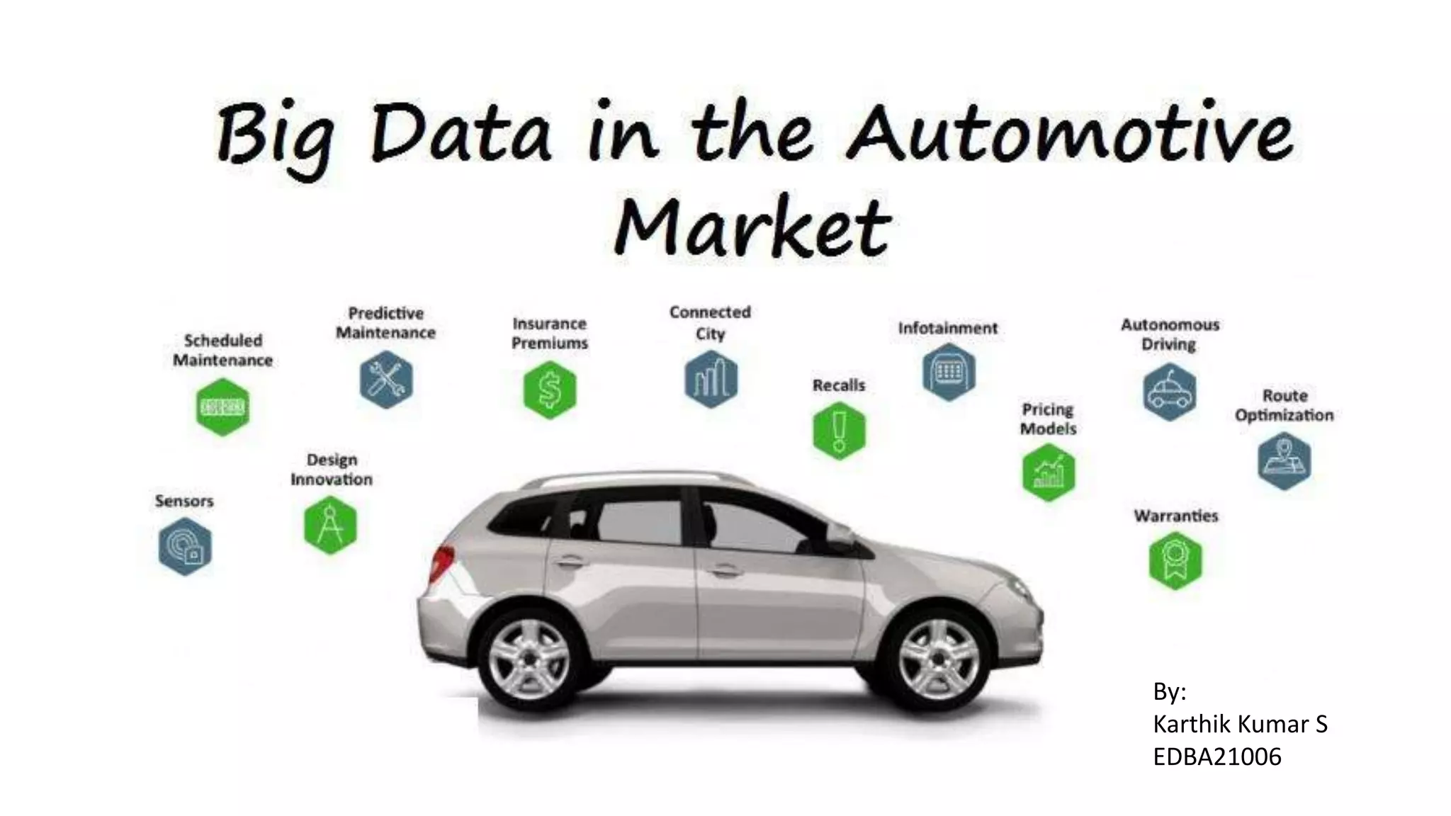 The document discusses the 5 V's of big data: volume refers to the large amounts of data companies manage and analyze as shown by vehicle sales numbers; variety means the diverse types of structured, unstructured, and raw data collected as depicted in an image of data acquisition methods; velocity is the speed at which data is received, stored, and managed shown by the rate of data capture per second; value refers to data usefulness being dependent on converting it into useful insights through processing; and veracity refers to ensuring data quality and credibility as shown by a 100% autonomous data penetration rate.