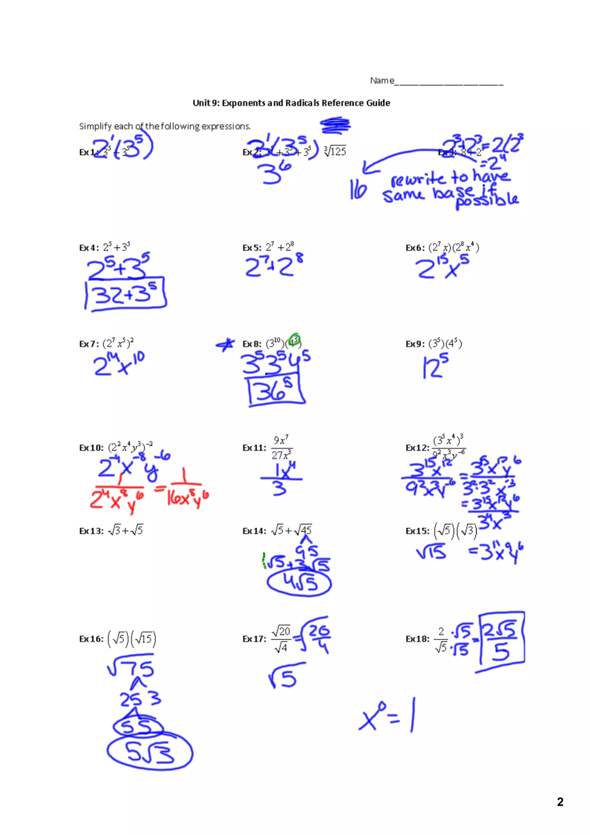 This document provides an overview of exponents, radicals, and rational/irrational numbers. It includes examples and homework problems. The document instructs students to: