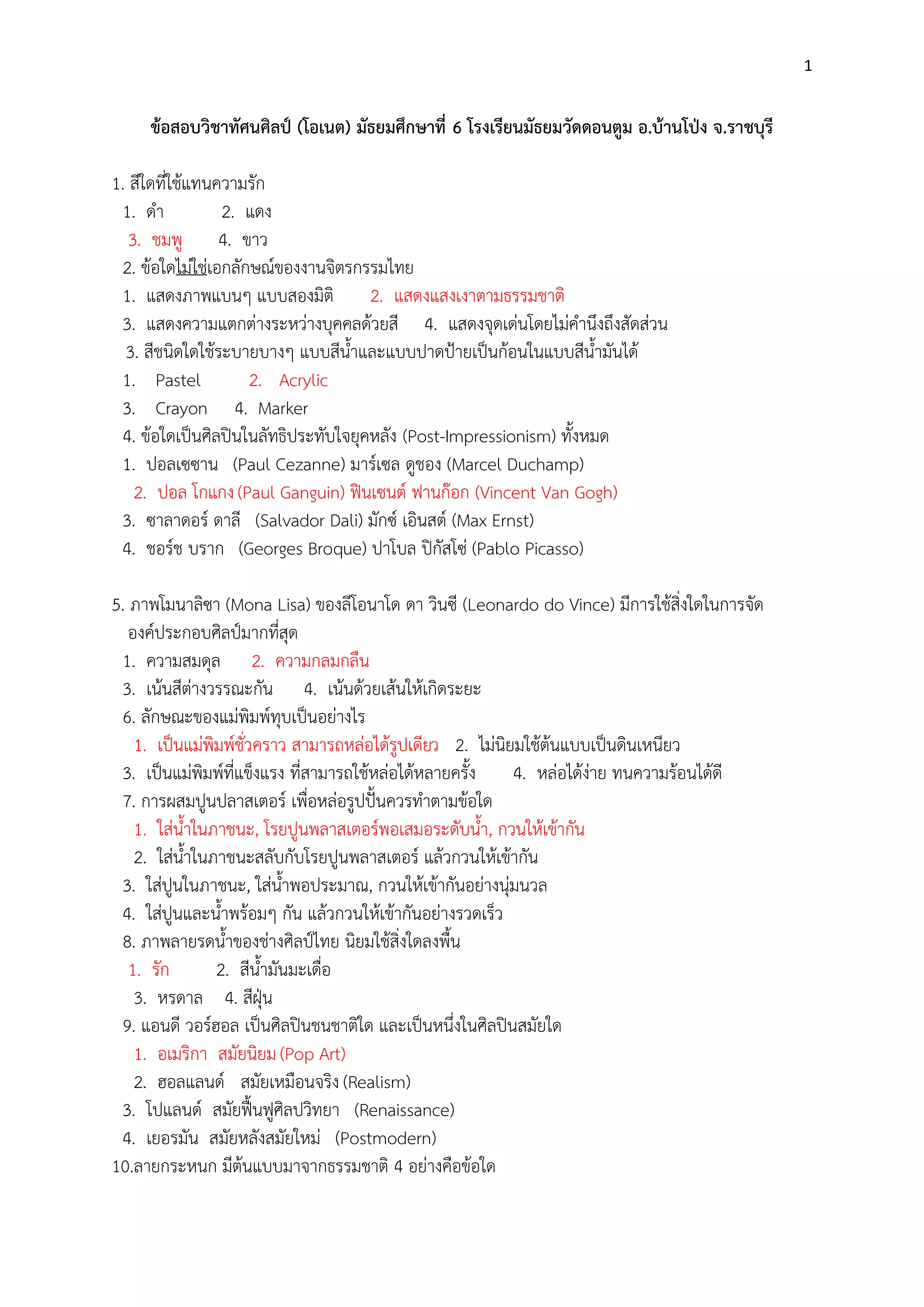 6 โรงเรียนมัธยมวัดดอนตูม อ.บ้านโป่ง จ.ราชบุรี 1. สีใดที่ใช๎แทนความรัก 1. ดา 2. แดง 3. ชมพู 4. ขาว 2. ข๎อใดไมํใชํเอกลักษณ์ของงานจิตรกรรมไทย 1. แสดงภาพแบนๆ แบบสองมิติ 2. แสดงแสงเงาตามธรรมชาติ 3. แสดงความแตกตํางระหวํางบุคคลด๎วยสี 4. แสดงจุดเดํนโดยไมํคานึงถึงสัดสํวน 3. สีชนิดใดใช๎ระบายบางๆ แบบสีน้าและแบบปาดปูายเป็นก๎อนในแบบสีน้ามันได๎ 1. Pastel 2. Acrylic 3. Crayon 4. Marker 4. ข๎อใดเป็นศิลปินในลัทธิประทับใจยุคหลัง (Post-Impressionism) ทั้งหมด 1. ปอลเซซาน (Paul Cezanne) มาร์เซล ดูชอง (Marcel Duchamp) 2. ปอล โกแกง (Paul Ganguin) ฟินเซนต์ ฟานก๏อก (Vincent Van Gogh) 3. ซาลาดอร์ ดาลี (Salvador Dali) มักซ์ เอินสต์ (Max Ernst) 4. ชอร์ช บราก (Georges Broque) ปาโบล ปิกัสโซํ (Pablo Picasso) 5. ภาพโมนาลิซา (Mona Lisa) ของลีโอนาโด ดา วินซี (Leonardo do Vince) มีการใช๎สิ่งใดในการจัด องค์ประกอบศิลป์มากที่สุด 1. ความสมดุล 2. ความกลมกลืน 3. เน๎นสีตํางวรรณะกัน 4. เน๎นด๎วยเส๎นให๎เกิดระยะ 6. ลักษณะของแมํพิมพ์ทุบเป็นอยํางไร 1. เป็นแมํพิมพ์ชั่วคราว สามารถหลํอได๎รูปเดียว 2. ไมํนิยมใช๎ต๎นแบบเป็นดินเหนียว 3. เป็นแมํพิมพ์ที่แข็งแรง ที่สามารถใช๎หลํอได๎หลายครั้ง 4. หลํอได๎งําย ทนความร๎อนได๎ดี 7. การผสมปูนปลาสเตอร์ เพื่อหลํอรูปปั้นควรทาตามข๎อใด 1. ใสํน้าในภาชนะ, โรยปูนพลาสเตอร์พอเสมอระดับน้า, กวนให๎เข๎ากัน 2. ใสํน้าในภาชนะสลับกับโรยปูนพลาสเตอร์ แล๎วกวนให๎เข๎ากัน 3. ใสํปูนในภาชนะ, ใสํน้าพอประมาณ, กวนให๎เข๎ากันอยํางนุํมนวล 4. ใสํปูนและน้าพร๎อมๆ กัน แล๎วกวนให๎เข๎ากันอยํางรวดเร็ว 8. ภาพลายรดน้าของชํางศิลป์ไทย นิยมใช๎สิ่งใดลงพื้น 1. รัก 2. สีน้ามันมะเดื่อ 3. หรดาล 4. สีฝุน 9. แอนดี วอร์ฮอล เป็นศิลปินชนชาติใด และเป็นหนึ่งในศิลปินสมัยใด 1. อเมริกา สมัยนิยม (Pop Art) 2. ฮอลแลนด์ สมัยเหมือนจริง (Realism) 3. โปแลนด์ สมัยฟื้นฟูศิลปวิทยา (Renaissance) 4. เยอรมัน สมัยหลังสมัยใหมํ (Postmodern) 10.ลายกระหนก มีต๎นแบบมาจากธรรมชาติ 4 อยํางคือข๎อใด