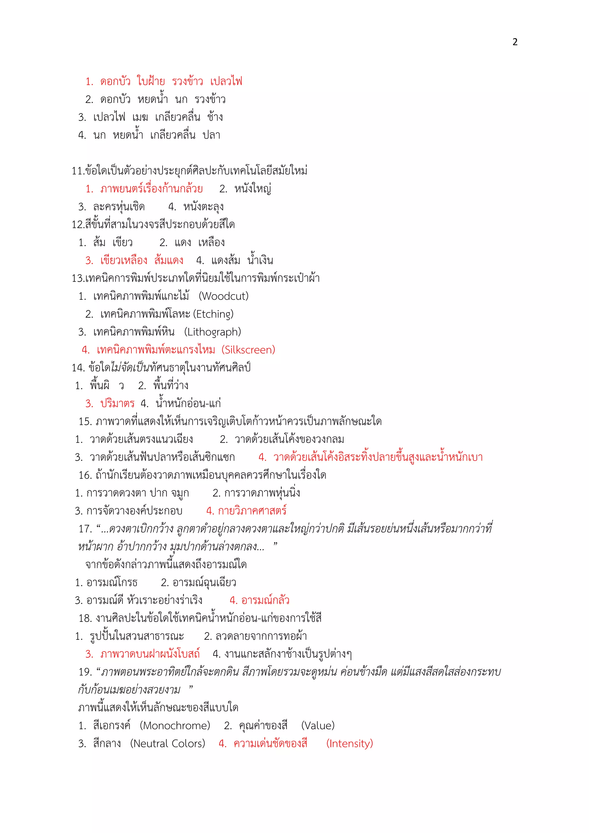 รวงข๎าว เปลวไฟ 2. ดอกบัว หยดน้า นก รวงข๎าว 3. เปลวไฟ เมฆ เกลียวคลื่น ช๎าง 4. นก หยดน้า เกลียวคลื่น ปลา 11.ข๎อใดเป็นตัวอยํางประยุกต์ศิลปะกับเทคโนโลยีสมัยใหมํ 1. ภาพยนตร์เรื่องก๎านกล๎วย 2. หนังใหญํ 3. ละครหุํนเชิด 4. หนังตะลุง 12.สีขั้นที่สามในวงจรสีประกอบด๎วยสีใด 1. ส๎ม เขียว 2. แดง เหลือง 3. เขียวเหลือง ส๎มแดง 4. แดงส๎ม น้าเงิน 13.เทคนิคการพิมพ์ประเภทใดที่นิยมใช๎ในการพิมพ์กระเป๋าผ๎า 1. เทคนิคภาพพิมพ์แกะไม๎ (Woodcut) 2. เทคนิคภาพพิมพ์โลหะ (Etching) 3. เทคนิคภาพพิมพ์หิน (Lithograph) 4. เทคนิคภาพพิมพ์ตะแกรงไหม (Silkscreen) 14. ข๎อใดไม่จัดเป็นทัศนธาตุในงานทัศนศิลป์ 1. พื้นผิ ว 2. พื้นที่วําง 3. ปริมาตร 4. น้าหนักอํอน-แกํ 15. ภาพวาดที่แสดงให๎เห็นการเจริญเติบโตก๎าวหน๎าควรเป็นภาพลักษณะใด 1. วาดด๎วยเส๎นตรงแนวเฉียง 2. วาดด๎วยเส๎นโค๎งของวงกลม 3. วาดด๎วยเส๎นฟันปลาหรือเส๎นซิกแซก 4. วาดด๎วยเส๎นโค๎งอิสระทิ้งปลายขึ้นสูงและน้าหนักเบา 16. ถ๎านักเรียนต๎องวาดภาพเหมือนบุคคลควรศึกษาในเรื่องใด 1. การวาดดวงตา ปาก จมูก 2. การวาดภาพหุํนนิ่ง 3. การจัดวางองค์ประกอบ 4. กายวิภาคศาสตร์ 17. “...ดวงตาเบิกกว้าง ลูกตาดาอยู่กลางดวงตาและใหญ่กว่าปกติ มีเส้นรอยย่นหนึ่งเส้นหรือมากกว่าที่ หน้าผาก อ้าปากกว้าง มุมปากด้านล่างตกลง... ” จากข๎อดังกลําวภาพนี้แสดงถึงอารมณ์ใด 1. อารมณ์โกรธ 2. อารมณ์ฉุนเฉียว 3. อารมณ์ดี หัวเราะอยํางรําเริง 4. อารมณ์กลัว 18. งานศิลปะในข๎อใดใช๎เทคนิคน้าหนักอํอน-แกํของการใช๎สี 1. รูปปั้นในสวนสาธารณะ 2. ลวดลายจากการทอผ๎า 3. ภาพวาดบนฝาผนังโบสถ์ 4. งานแกะสลักงาช๎างเป็นรูปตํางๆ 19. “ภาพตอนพระอาทิตย์ใกล้จะตกดิน สีภาพโดยรวมจะดูหม่น ค่อนข้างมืด แต่มีแสงสีสดใสส่องกระทบ กับก้อนเมฆอย่างสวยงาม ” ภาพนี้แสดงให๎เห็นลักษณะของสีแบบใด 1. สีเอกรงค์ (Monochrome) 2. คุณคําของสี (Value) 3. สีกลาง (Neutral Colors) 4. ความเดํนชัดของสี (Intensity)