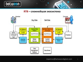 Документ обсуждает современные проблемы и решения в области RTB-рекламы, включая необходимость улучшения качества креативов и площадок. Приводятся методы оптимизации рекламных кампаний через динамическое создание креативов и анализ метрик взаимодействия. Также содержится информация о деятельности компании Between Digital, предлагающей решения для монетизации трафика и оптимизации рекламных процессов.