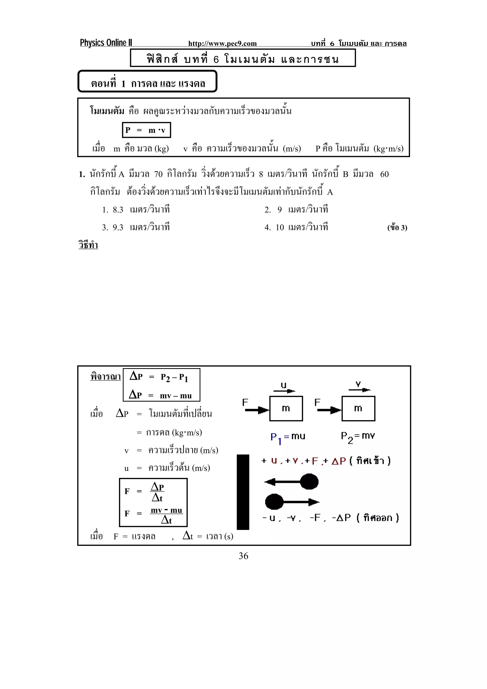 http://www.pec9.com บทที่ 6 โมเมนตัม และ การดล ฟ สิ ก ส บทที่ 6 โมเมนตั ม และการชน ตอนที่ 1 การดล และ แรงดล โมเมนตัม คือ ผลคูณระหวางมวลกับความเร็วของมวลนั้น P = m ⋅v เมือ m คือ มวล (kg) v คือ ความเรวของมวลนน (m/s) ่ ็ ้ั P คือ โมเมนตม (kg⋅m/s) ั 1. นักรักบี้ A มีมวล 70 กิโลกรัม วงดวยความเรว 8 เมตร/วินาที นักรักบี้ B มีมวล 60 ่ิ ็ กิโลกรัม ตองวงดวยความเรวเทาไรจงจะมโมเมนตมเทากบนกรกบ้ี A ่ิ ็ ึ ี ั ั ั ั 1. 8.3 เมตร/วินาที 2. 9 เมตร/วินาที 3. 9.3 เมตร/วินาที 4. 10 เมตร/วินาที (ขอ 3) วธทา ิี ํ พิจารณา ∆P = P2 – P1 ∆P = mv – mu เมือ ∆P = โมเมนตัมที่เปลี่ยน ่ = การดล (kg⋅m/s) v = ความเร็วปลาย (m/s) u = ความเรวตน (m/s) ็ F = ∆P ∆t F = mv - mu ∆t เมือ F = แรงดล , ∆t = เวลา (s) ่ 36