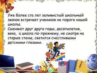 Документ посвящен 110-летию школы и воспоминаниям выпускников о ее истории и значении в их жизни. Он включает личные истории семей, которые учились в школе, их учителей и значимые события, произошедшие в разные годы. Выпускники выражают благодарность школе за полученные знания и воспоминания, подчеркивая важность преемственности поколений.