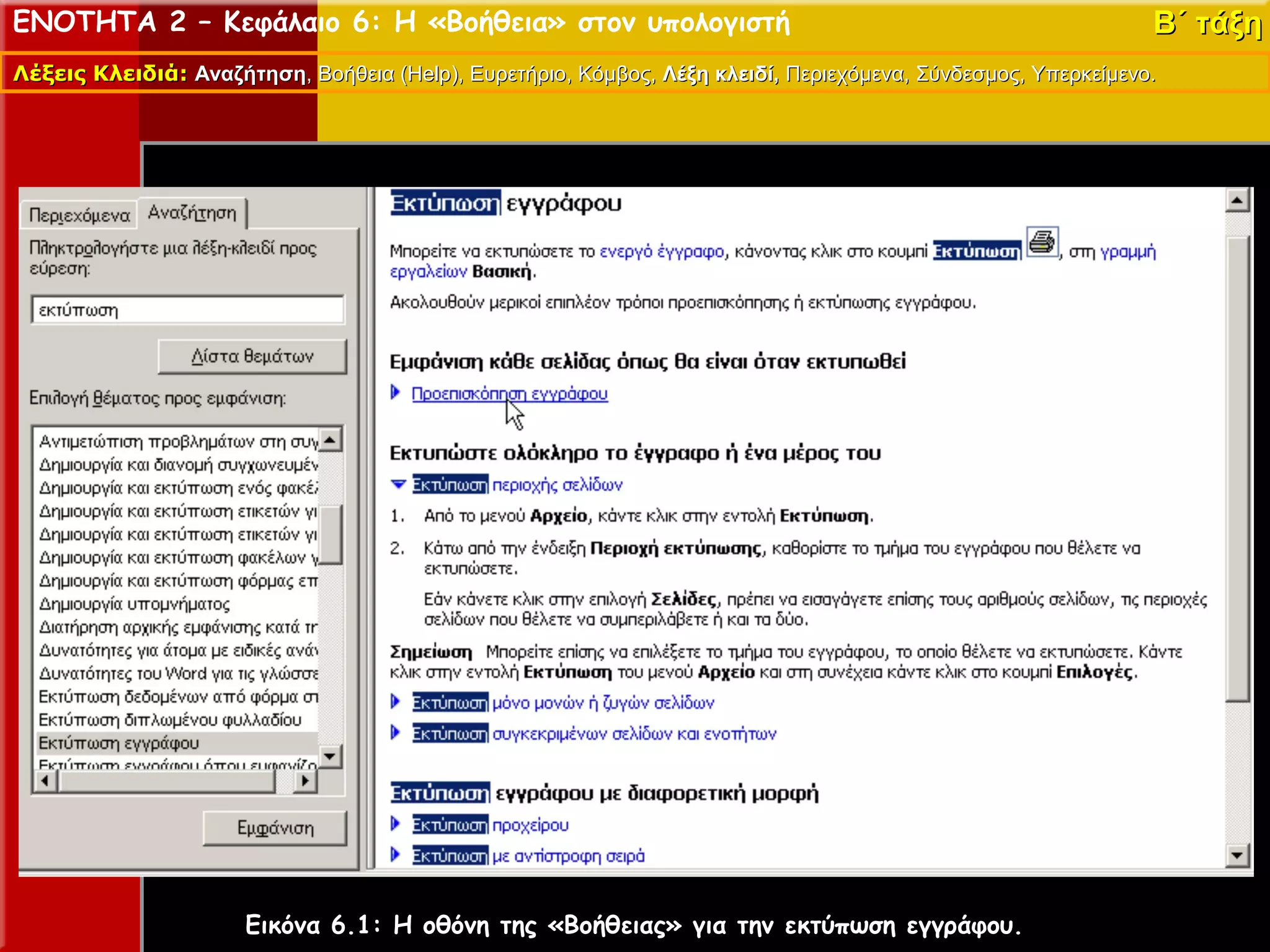 Εικόνα 6.1: Η οθόνη της «Βοήθειας» για την εκτύπωση εγγράφου.