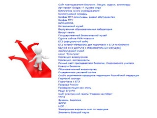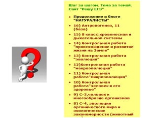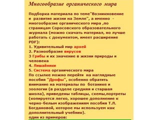 Документ представляет собой набор ссылок и заметок по темам биологии, включая генетику, ботанику и эволюцию. Он призывает к обучению для практического применения знаний, содержит задания для учеников и информацию о тестировании учителей. Также упоминается общее разнообразие органического мира и полезные ресурсы для подготовки к экзаменам.