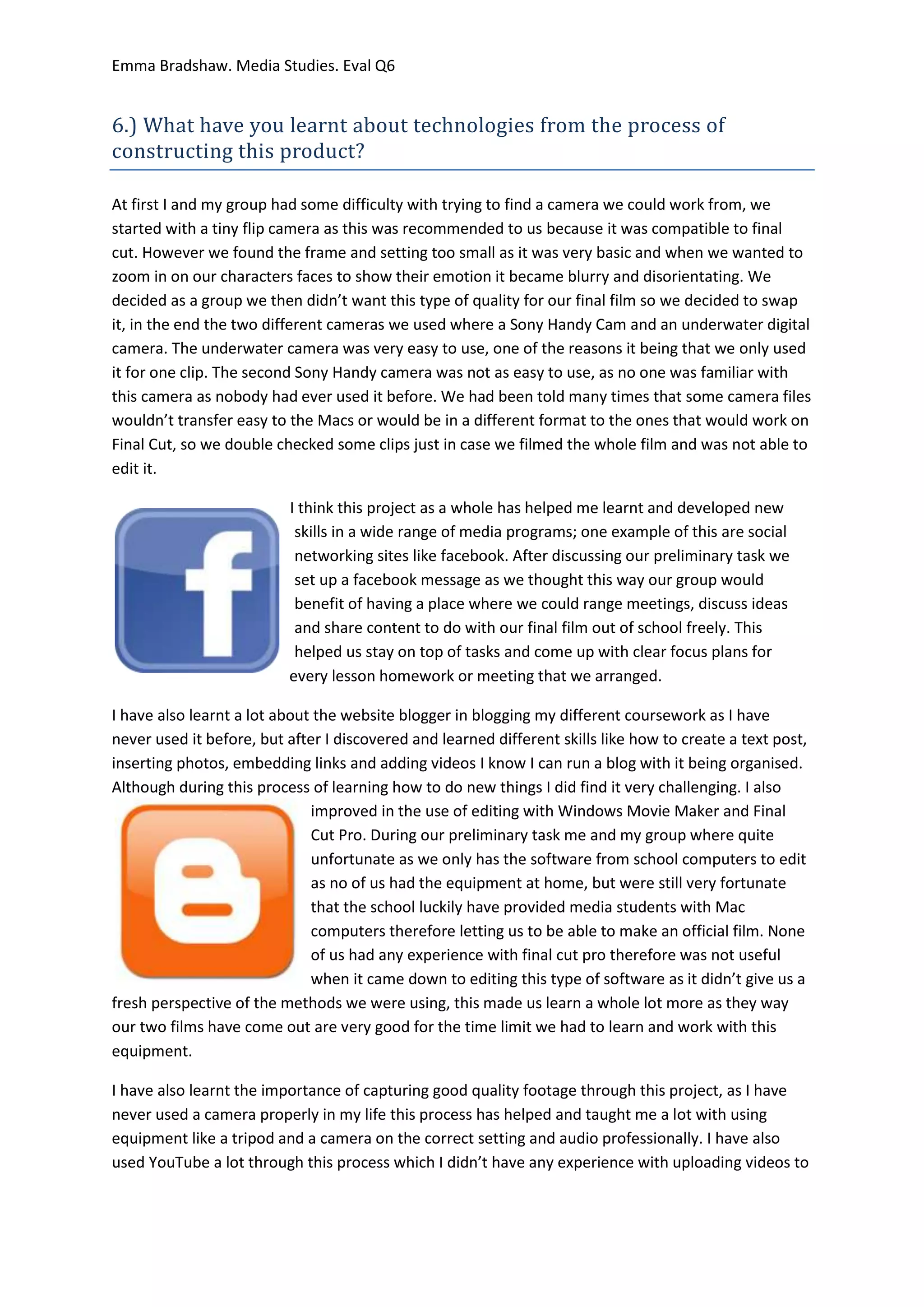 The student learned several things about technologies from constructing a film project with their group. Initially, they struggled to find a suitable camera but eventually settled on a Sony Handy Cam and underwater camera. Both cameras presented challenges - the underwater camera was only used briefly while the Sony was unfamiliar. The student also learned how to use social media, blogging software, video editing software and capturing good quality footage with cameras and audio equipment. Overall, the project helped the student develop new technical skills that will be useful for future media projects.
