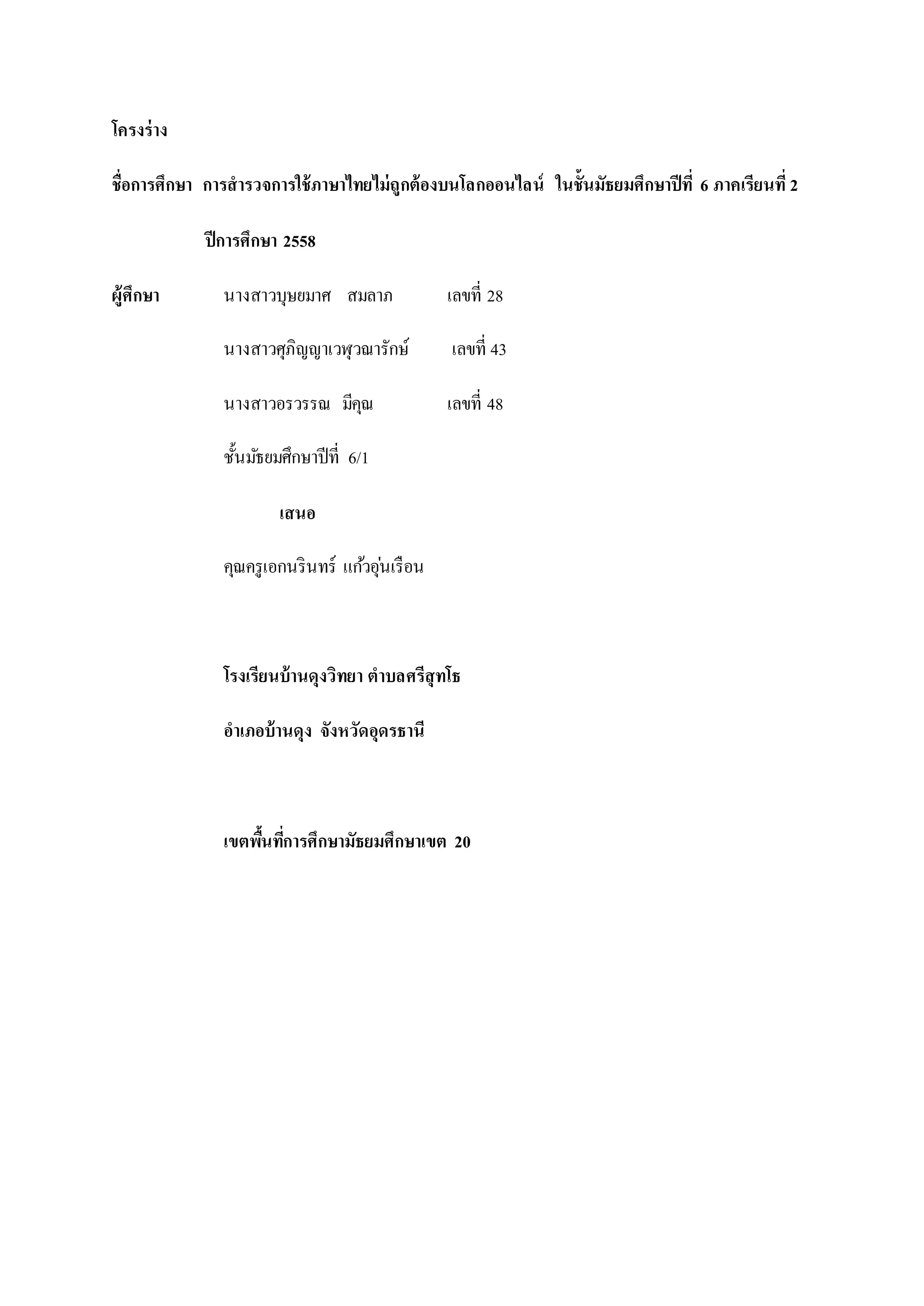 การสำรวจการใช้ภาษาไทยไม่ถูกต้องบนโลกออนไลน์ ในชั้นมัธยมศึกษาปีที่ 6 ภาคเรียนที่ 2