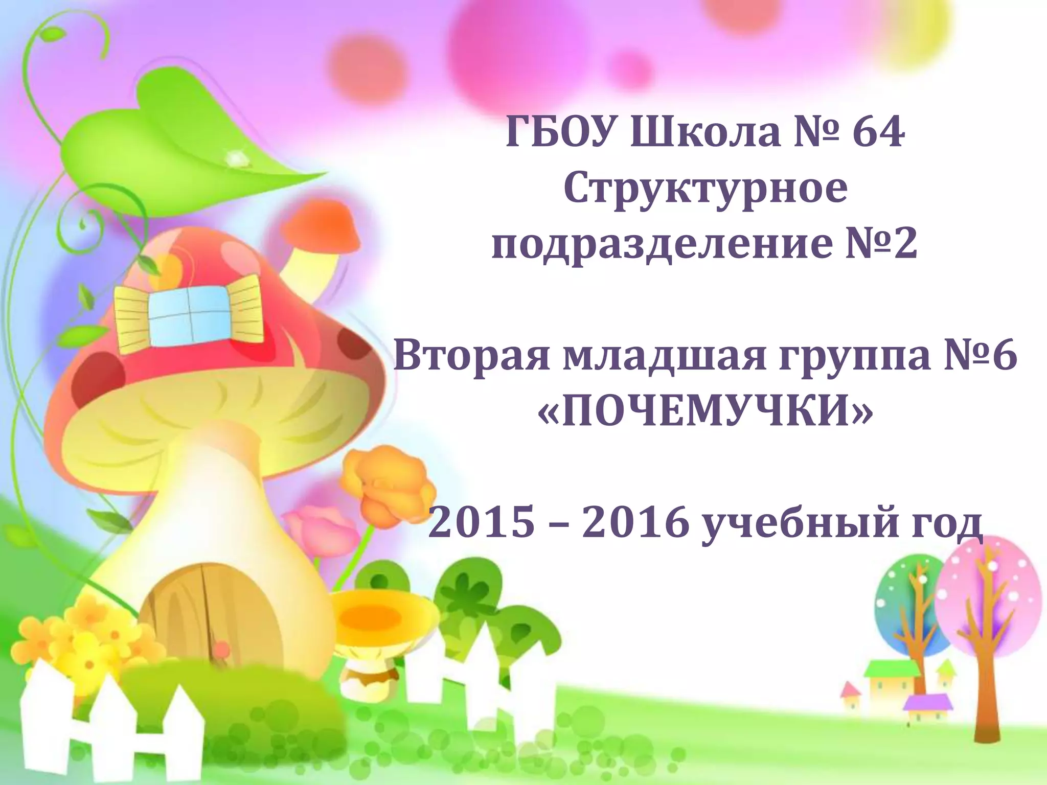 Документ описывает организацию и деятельность второй младшей группы «Почемучки» в ГБОУ школе № 64 в течение учебного года 2015-2016. В нем представлены основные аспекты работы с детьми и образовательные программы группы. Основное внимание уделяется развитию познавательных интересов и навыков у детей.