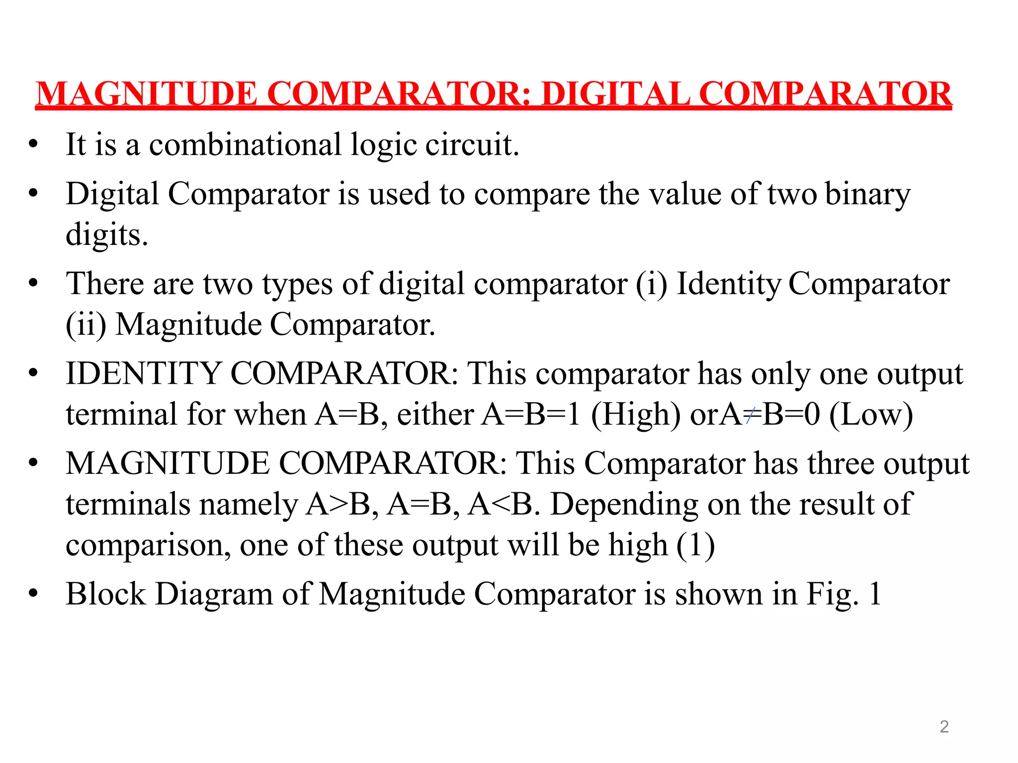 A magnitude comparator is a digital circuit that compares the values of two binary numbers and outputs whether the first number is greater than, less than, or equal to the second number. It has three output terminals for these comparisons. A 1-bit magnitude comparator uses AND gates to compare single bits and produce a truth table with the three possible outputs. A 2-bit magnitude comparator extends this to compare 2-bit binary numbers, using the outputs of multiple 1-bit comparators and additional logic gates to determine the relationship between the two numbers.