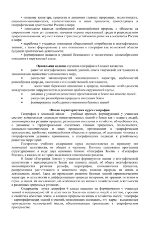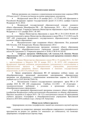Документ представляет рабочую программу по географии для учащихся с ограниченными возможностями здоровья, основанную на нормативных документах и образовательных стандартах. Основные цели включают формирование географических знаний, понимание взаимодействия природы и общества, а также развитие экологической сознательности. Программа структурирована по блокам и нацелена на создание целостного представления о Земле как планете людей, с акцентом на разнообразие природных и социальных процессов.