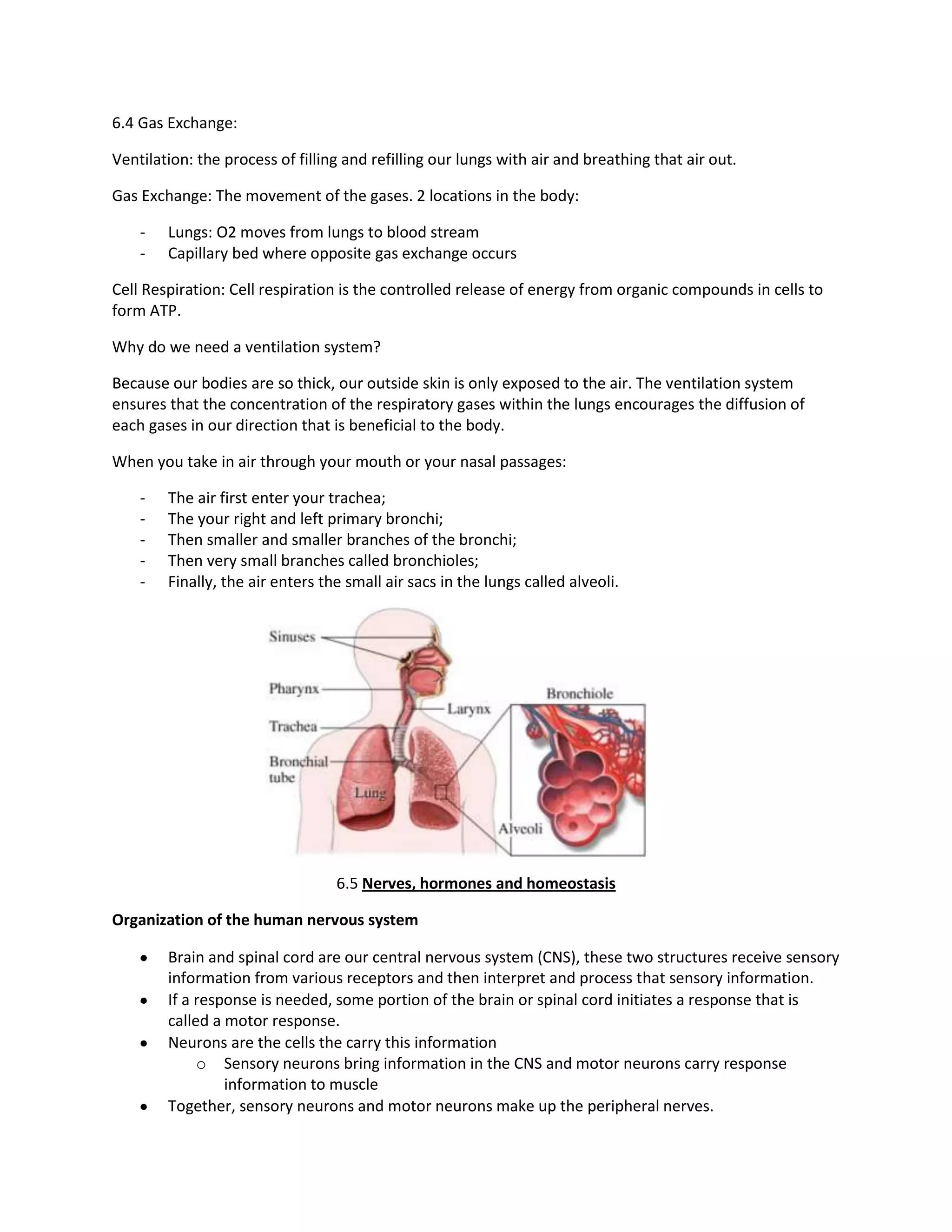The document discusses gas exchange and the human respiratory and nervous systems. It provides details on: