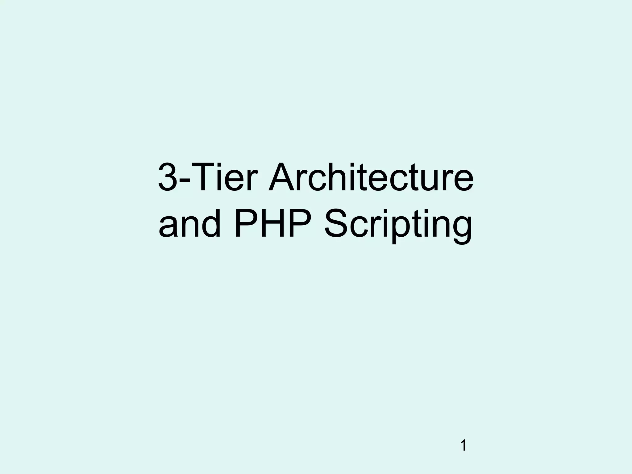 The document discusses 3-tier architecture and PHP scripting. It describes a 3-tier architecture with presentation, application, and persistence layers. The presentation layer includes the browser, application layer includes a web server and PHP scripts, and the persistence layer includes a relational database. It provides details on PHP, including its history, syntax based on C, function library, and use for embedding scripts in HTML pages. It also includes a basic photo album code example and resources for learning more about PHP.