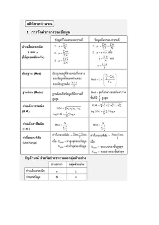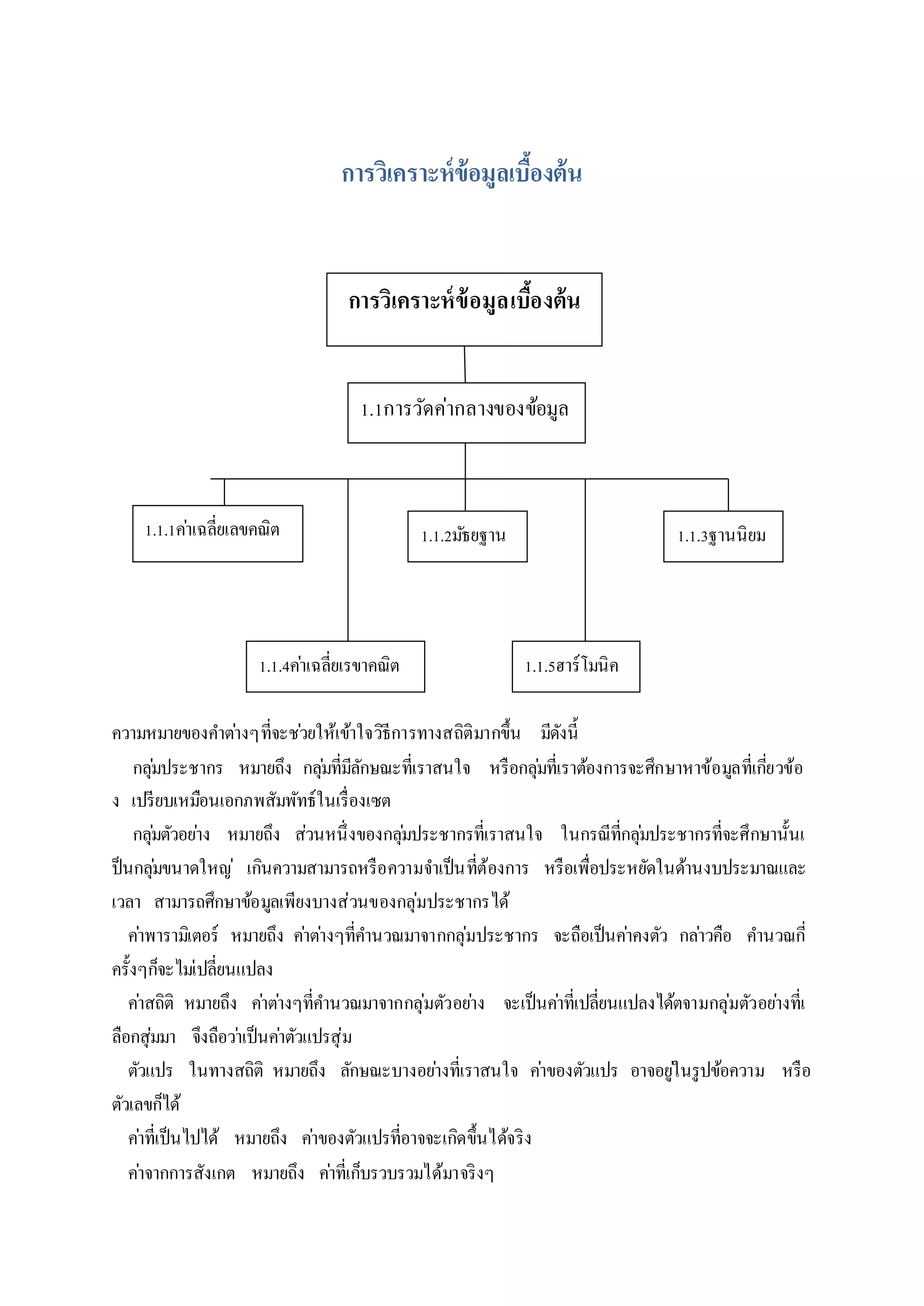 ข้อมูล 1.1.1คา่เฉลี่ยเลขคณิต 1.1.2มธัยฐาน 1.1.3ฐานนิยม 1.1.4คา่เฉลี่ยเรขาคณิต 1.1.5ฮาร์โมนิค ความหมายของคา ตา่งๆที่จะชว่ยให้เข้าใจวิธีการทางสถิติมากขึ้น มีดังนี้ กลุม่ประชากร หมายถึง กลุม่ที่มีลักษณะที่เราสนใจ หรือกลุม่ที่เราต้องการจะศึกษาหาข้อมูลที่เกยี่วข้อ ง เปรียบเหมือนเอกภพสัมพัทธ์ในเรื่องเซต กลุม่ตัวอยา่ง หมายถึง ส่วนหนึ่งของกลุม่ประชากรที่เราสนใจ ในกรณีที่กลุม่ประชากรที่จะศึกษานั้นเ ป็นกลุม่ขนาดใหญ่ เกินความสามารถหรือความจา เป็นที่ต้องการ หรือเพื่อประหยัดในด้านงบประมาณและ เวลา สามารถศึกษาข้อมูลเพียงบางส่วนของกลุ่มประชากรได้ คา่พารามิเตอร์ หมายถึง คา่ตา่งๆที่คา นวณมาจากกลุ่มประชากร จะถือเป็นคา่คงตัว กลา่วคือ คา นวณกี่ ครั้งๆก็จะไมเ่ปลี่ยนแปลง คา่สถิติ หมายถึง คา่ตา่งๆที่คา นวณมาจากกลุ่มตัวอยา่ง จะเป็นคา่ที่เปลี่ยนแปลงได้ตจามกลุ่มตัวอยา่งที่เ ลือกสุ่มมา จึงถือวา่เป็นคา่ตัวแปรสุ่ม ตัวแปร ในทางสถิติ หมายถึง ลักษณะบางอยา่งที่เราสนใจ คา่ของตัวแปร อาจอยูใ่นรูปข้อความ หรือ ตัวเลขก็ได้ คา่ที่เป็นไปได้ หมายถึง คา่ของตัวแปรที่อาจจะเกิดขึ้นได้จริง คา่จากการสังเกต หมายถึง คา่ที่เก็บรวบรวมได้มาจริงๆ